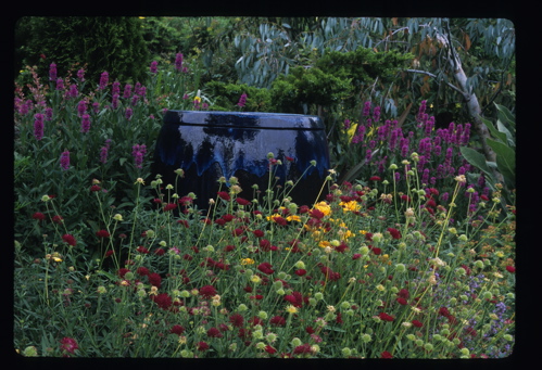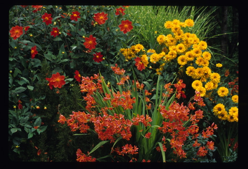 - Crocosmia ‘Star of the East’, Dahlia ‘Forncett’s Furnace, Miscanthus ‘Gold Bar’; Heronswood